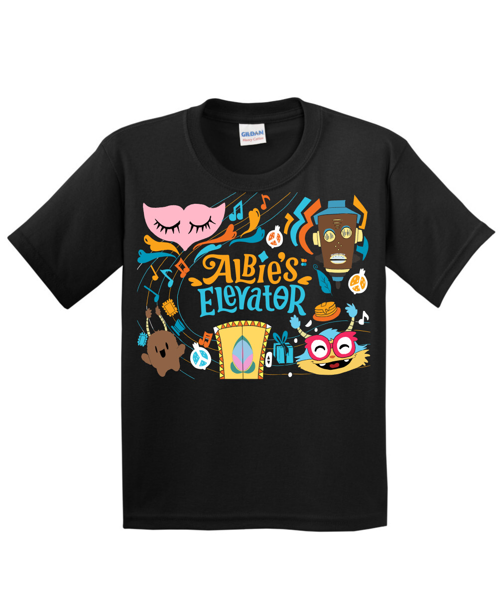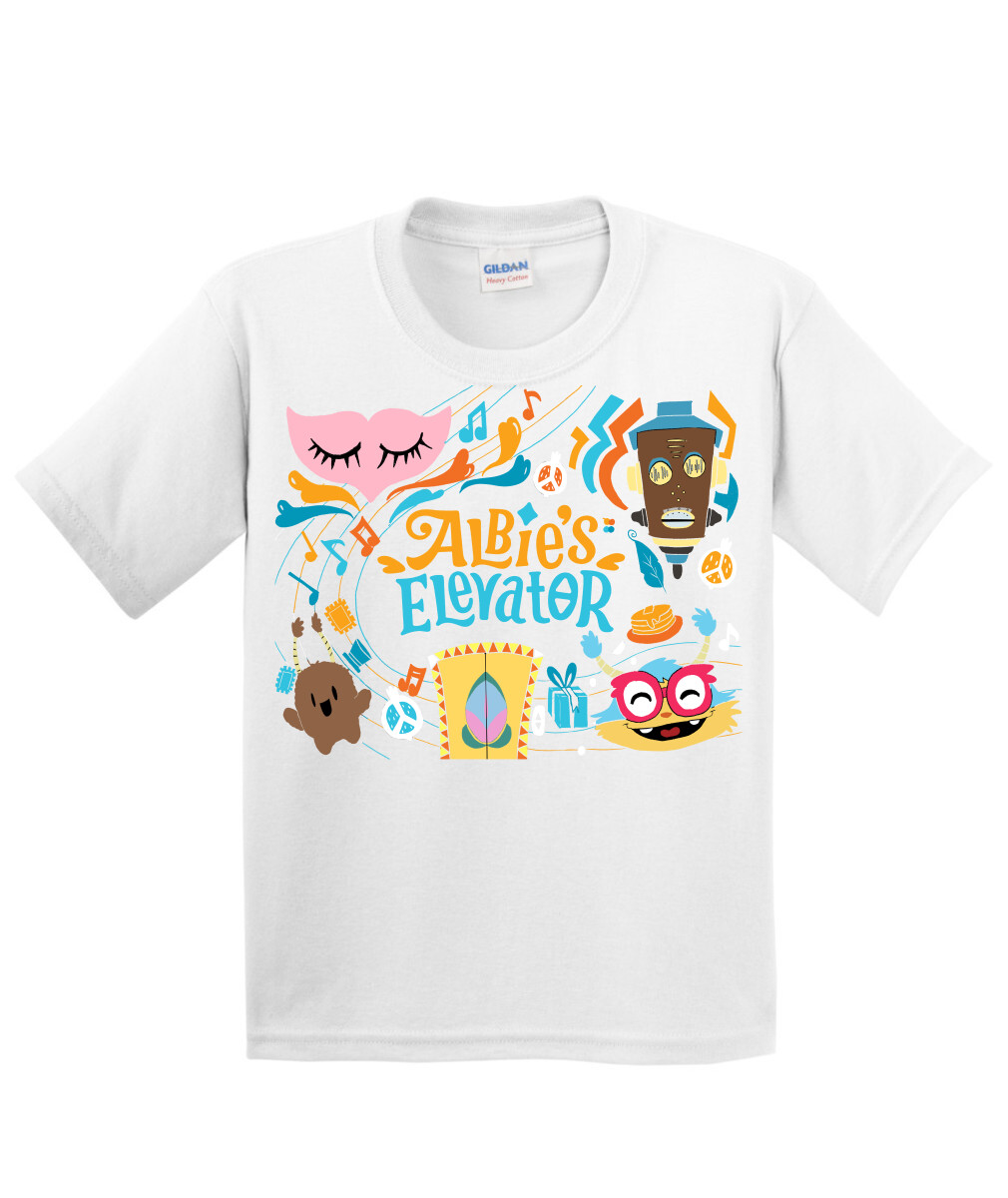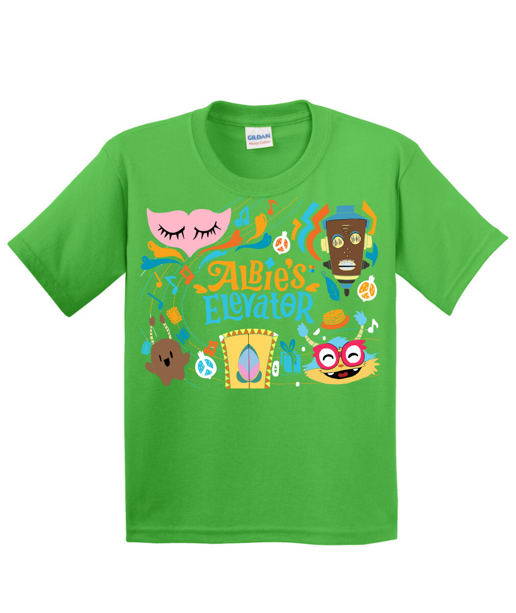 Each floor is a friend, each floor is a neighbor - on Albie's Elevator! Show off your PIZZAZZ with this shirt featuring the whole gang!